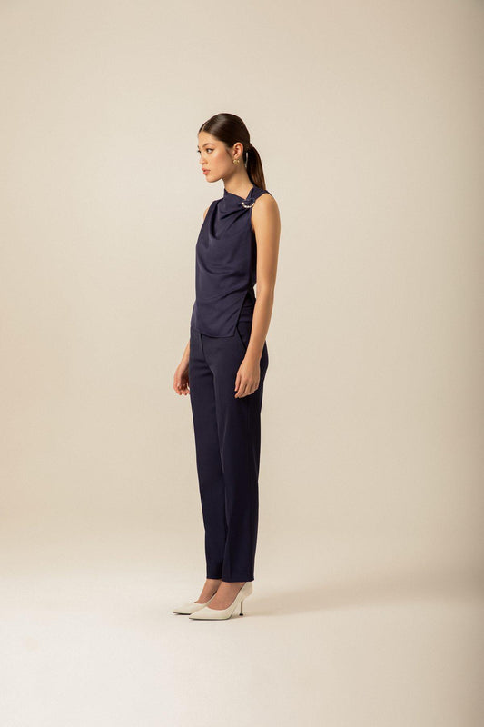 Yüksek Bel Cep Dikiş Detaylı Lacivert Pantolon
