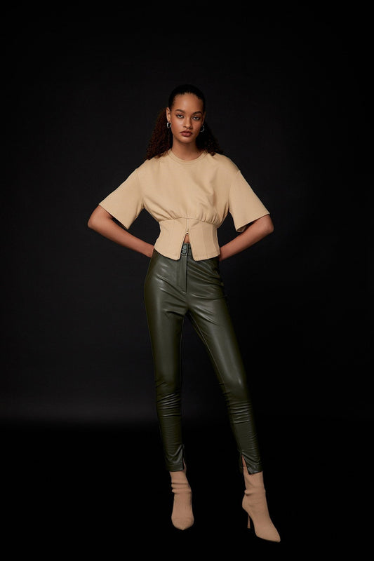 İndirimYüksek Bel Haki Suni Deri Tayt