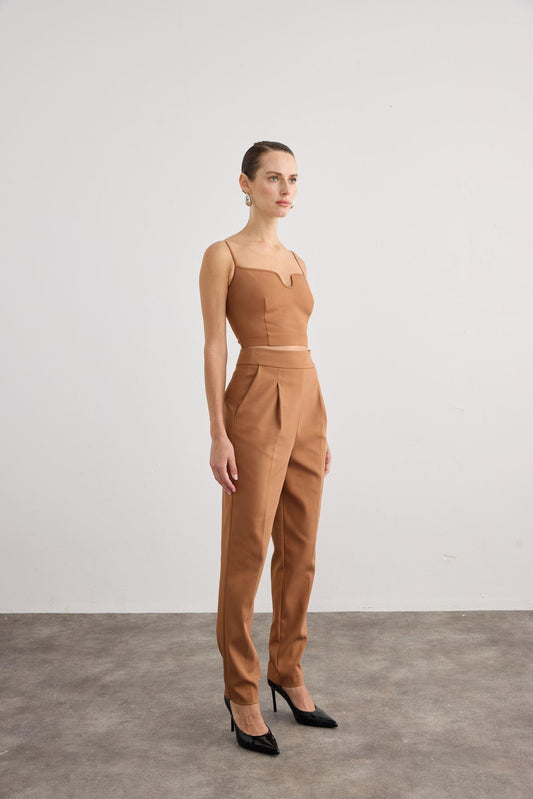 Yüksek Belli Önü Pileli Tütün Pantolon