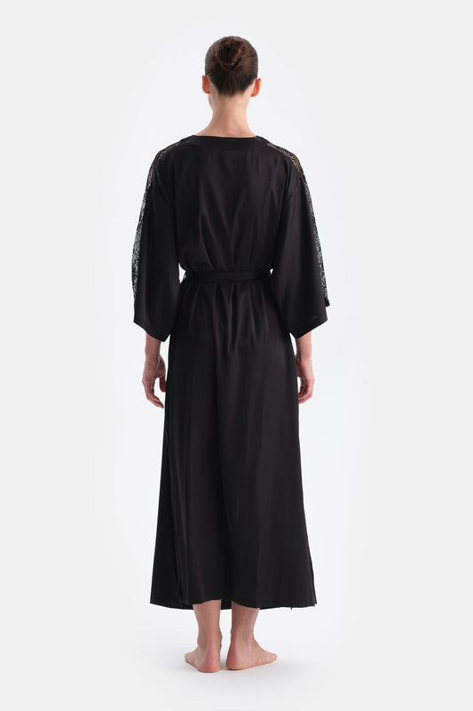 Siyah Dantel Detaylı Saten Brıde Sabahlık
