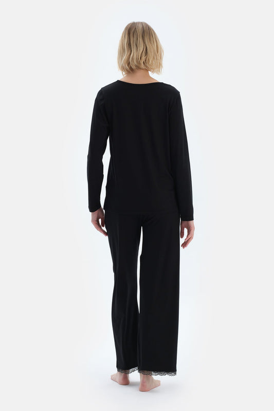 Siyah Dantel Detaylı V Yaka Uzun Kollu Tişört Pantolon Pijama Takımı