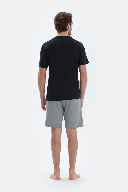 Siyah Yarım Patlı Kısa Kollu Şort Pantolon Üçlü Pijama Takımı