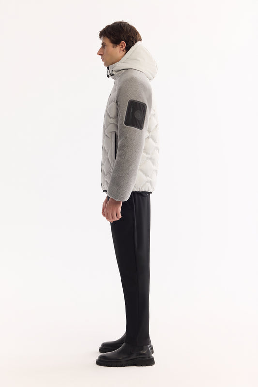 Beyaz Kapüşonlu Yaka Desenli Peluş Kumaş Mont