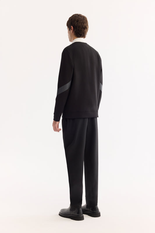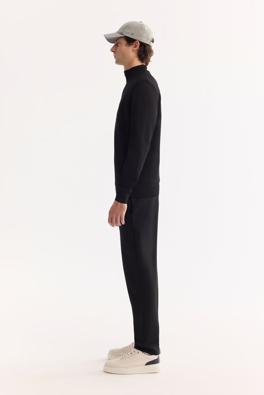 Siyah Dik Yaka Fermuarlı Dokulu Teknik Kumaş Hırka