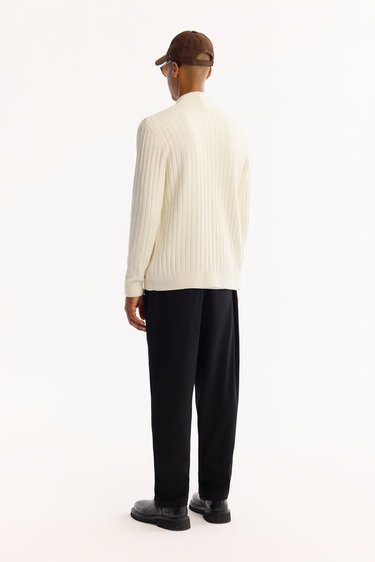 Ekru Fermuarlı Polo Yaka Ajurlu Rayon Iplik Kazak