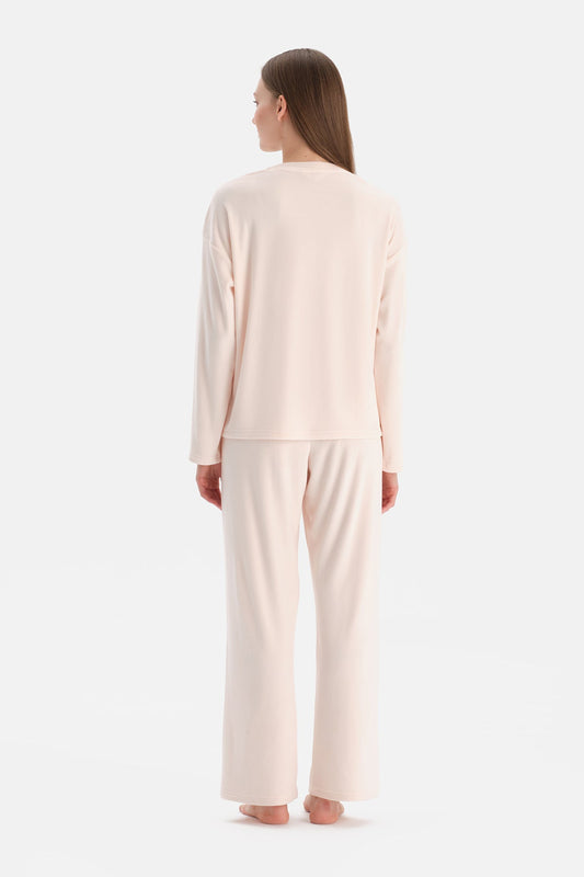 Açık Pembe Nakışlı Kadife Tişört Pantolon Pijama Takımı