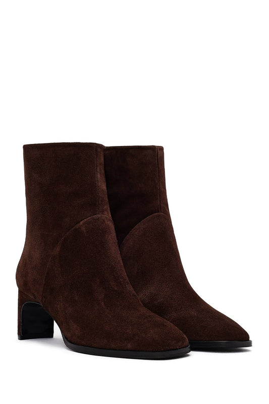• Kadın Kahverengi Fermuarlı Kısa Kalın Topuklu Süet Deri Bot