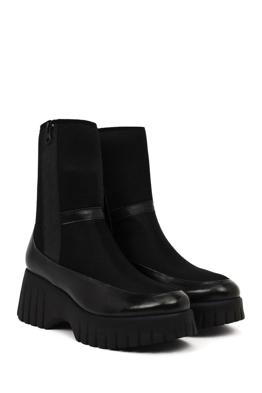 Kadın Siyah Fermuarlı Kalın Tabanlı Deri Bot