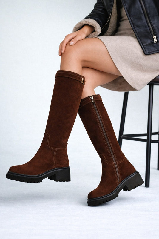 Kadın Kahverengi Fermuarlı Kalın Tabanlı Süet Deri Çizme
