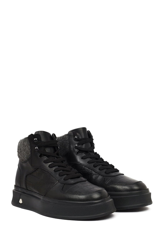 Erkek Siyah Bağcıklı Kalın Tabanlı Deri Spor Bot