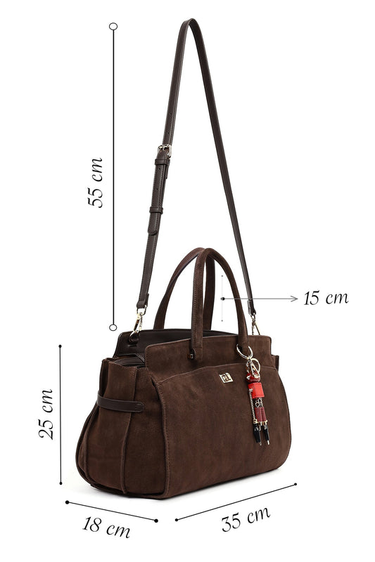Kadın Kahverengi Uzun Askılı Aksesuarlı Süet Kol Çantası