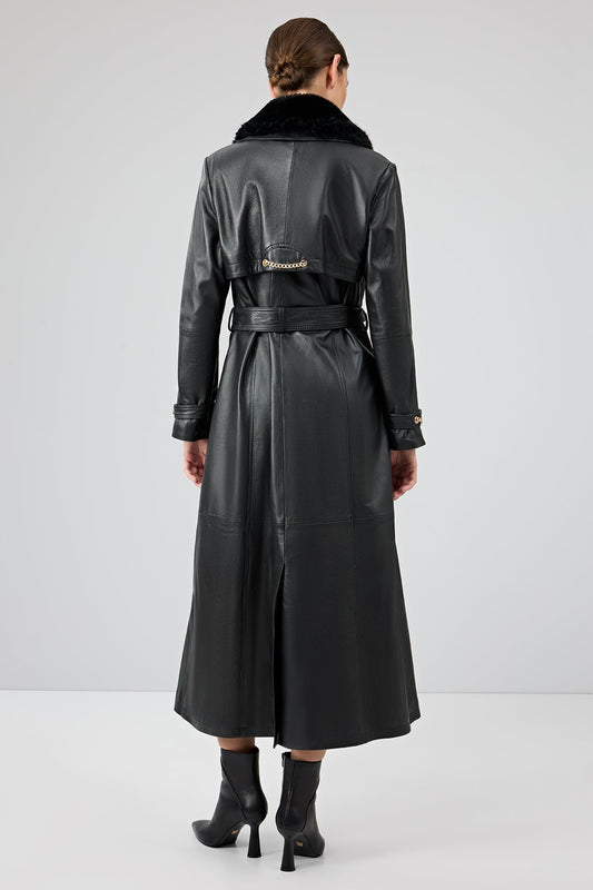 Jenny Kadın Siyah Yaka Kürklü Kemer Detaylı Deri Trençkot