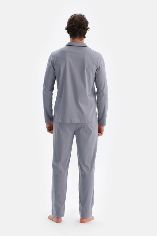 Gri Yarım Patlı Uzun Kollu Altı Baskılı Pijama Takımı