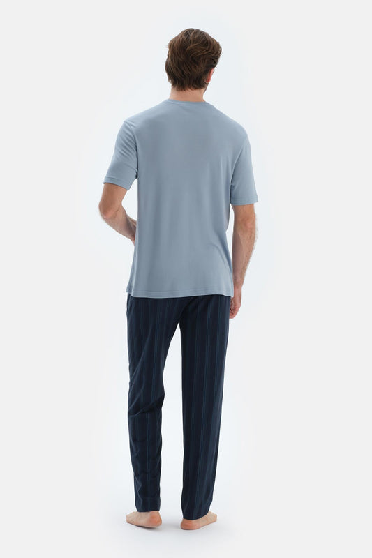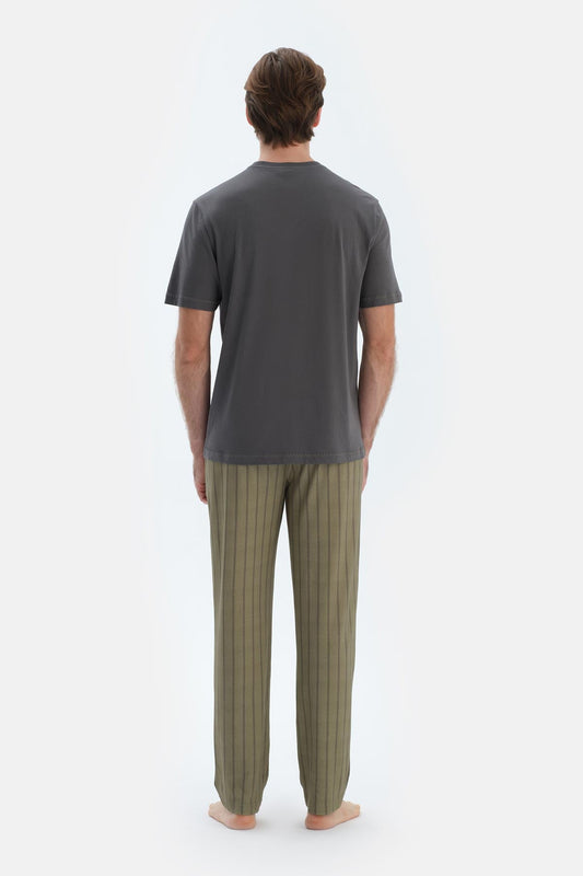 Gri Cep Detaylı Kısa Kollu Tişört Çizgili Pantolon Pijama Takımı