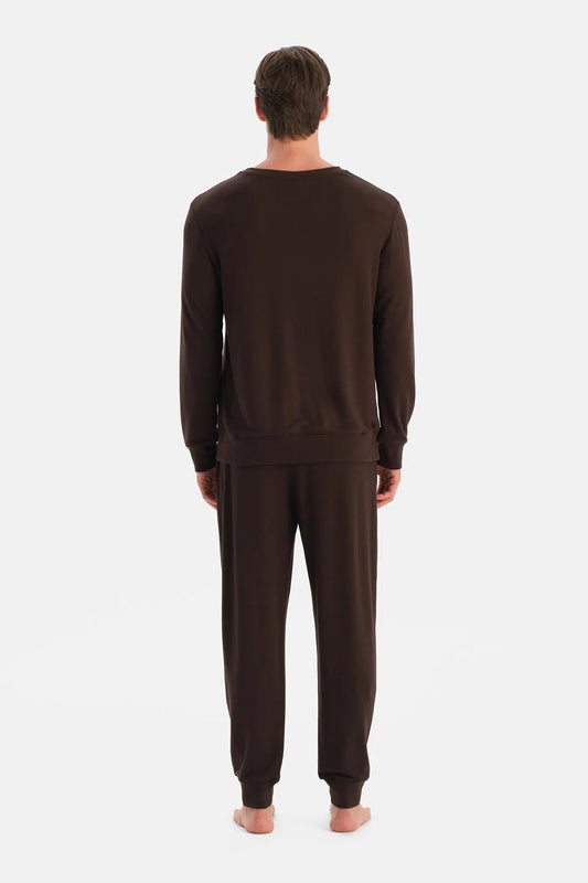 Koyu Kahve Dikiş Ve Bant Detaylı Uzun Kollu Tişört Pantolon Pijama Tak