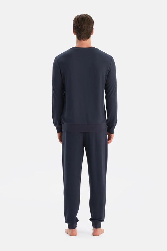 Lacivert Dikiş Ve Bant Detaylı Uzun Kollu Tişört Pantolon Pijama Takım