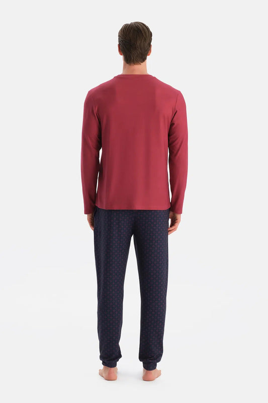 Kırmızı Dikiş Detaylı Uzun Kollu Termal Tişört Pantolon Pijama Takımı