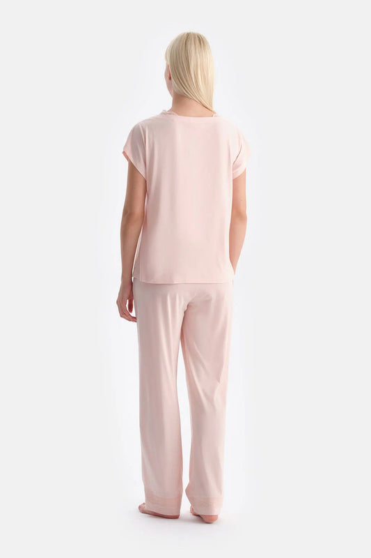 Dantel Detayli Kayik Yaka Tişört Pantolon Takim