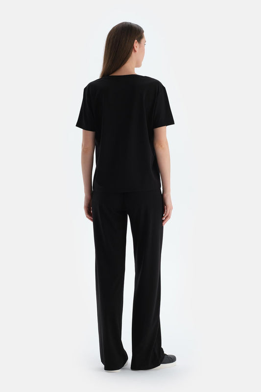 Ekru Baskı Detaylı Uzun Kollu Tişört Pantolon Pijama Takımı