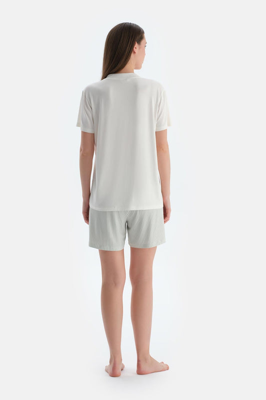 Ekru V Yaka Kısa Kollu Tişört Şort Pijama Takımı