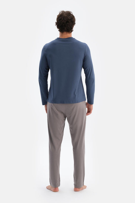 Mavi Patlı Uzun Kollu Tişört Pantolon Pijama Takımı