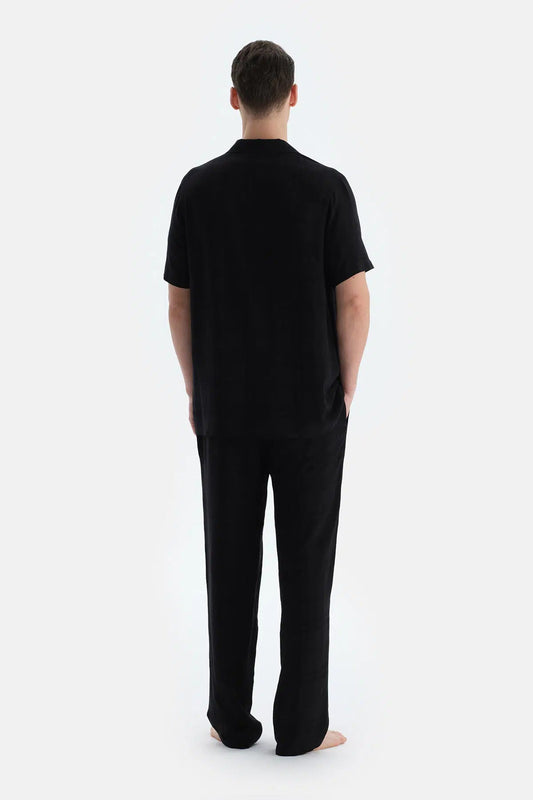 Siyah Çizgili Kısa Kollu Dokuma Groom Gömlek