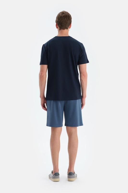 Lacivert Bisiklet Yaka Kısa Kollu Örme Keten Tişört