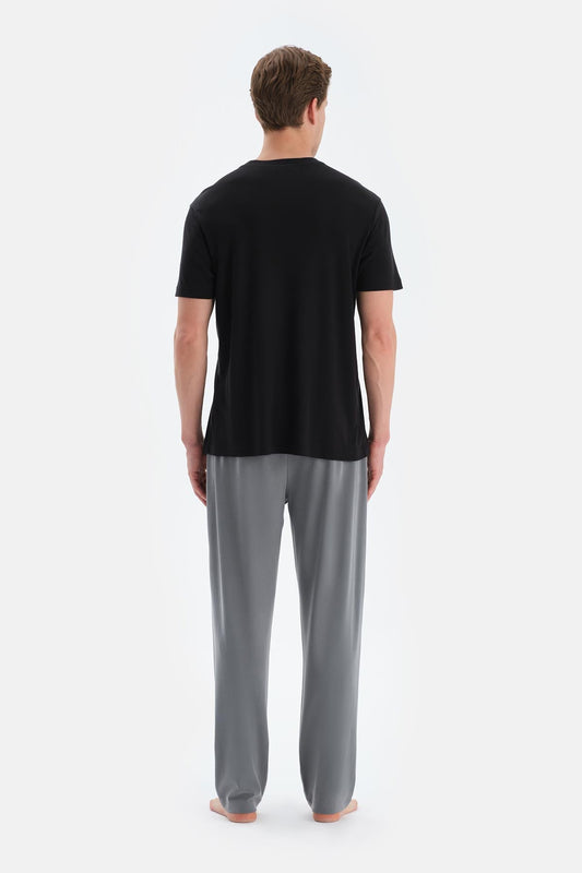Açık Gri Bisiklet Yaka Uzun Kollu Yünlü Pijama Takımı
