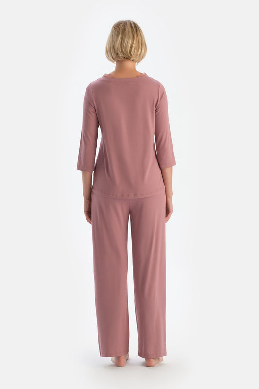 Gül Kurusu Kayık Yaka Dantel Detaylı Pijama Takımı