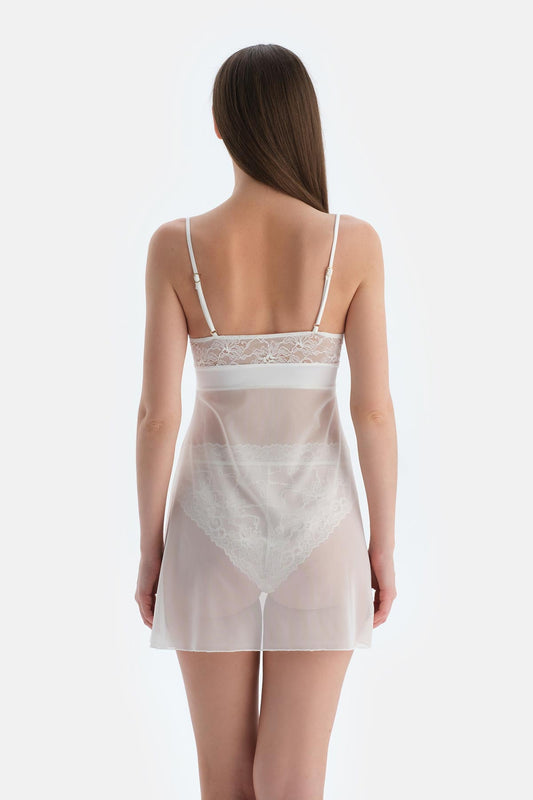 Beyaz Dantel Detaylı Tüllü Babydoll