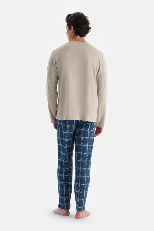 Gri V Yaka Baskı Detaylı Pantolon Pijama Takımı