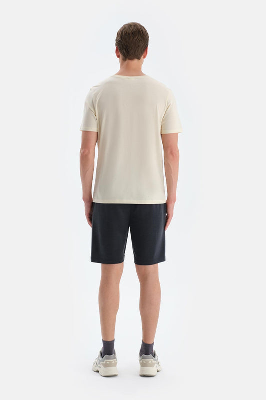 Ekru Bisiklet Yaka Ipek Apre Kısa Kollu Tişört