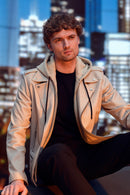 Butler Erkek Bej Kapüşonlu Biker Deri Ceket