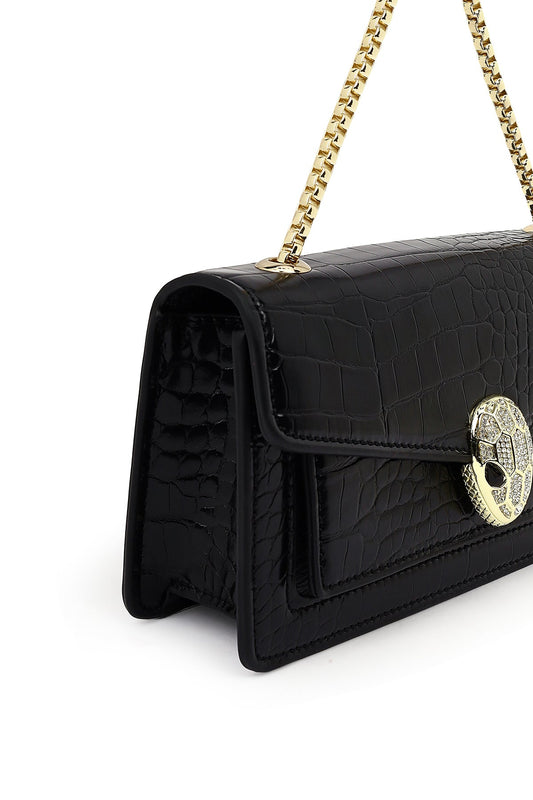 Kadın Siyah Uzun Zincir Askılı Rugan Mini Klasik Abiye Omuz Çantası
