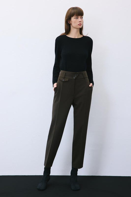 Pileli Dar Paça Yüksek Bel Haki Pantolon