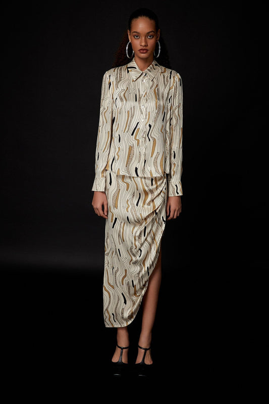 Drapeli Desenli Yırtmaçlı Bej Etek