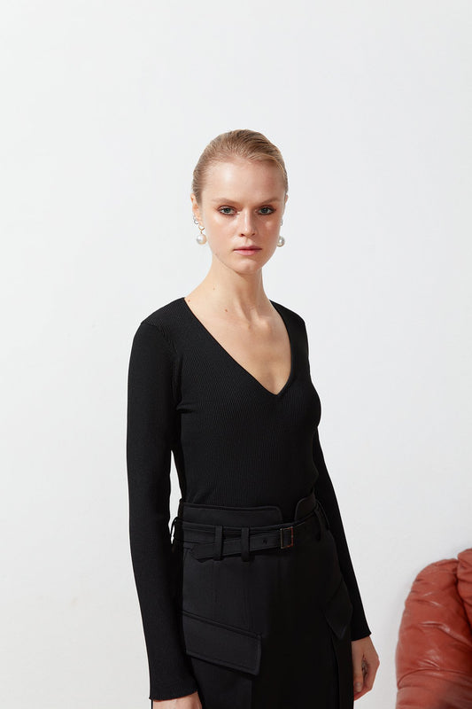 Siyah V Yaka Uzun Kollu Triko Body