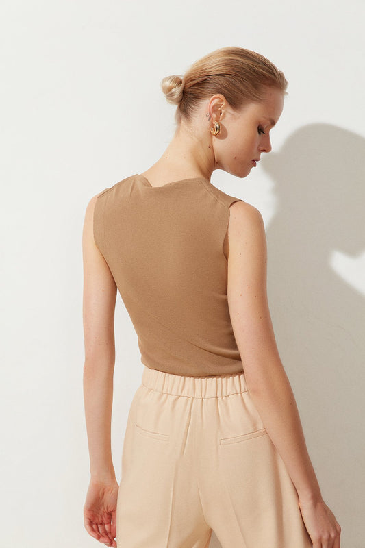 İndirimCamel V Yaka Kolsuz Triko Bluz