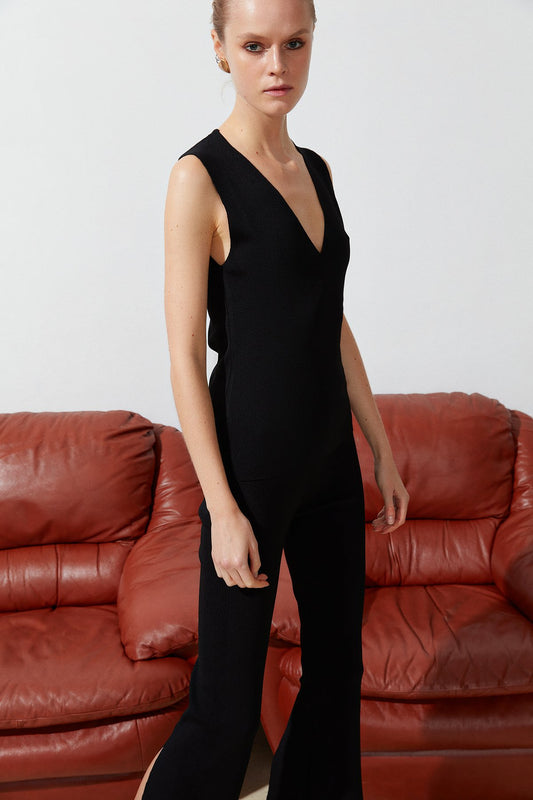 TükendiSiyah V Yaka Kolsuz Triko Bluz