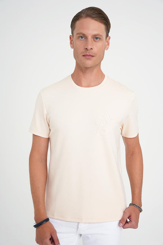 Comfort Fit Bisiklet Yaka Nakışlı Kısa Kol Açık Krem Pamuk Tişört Ts 910