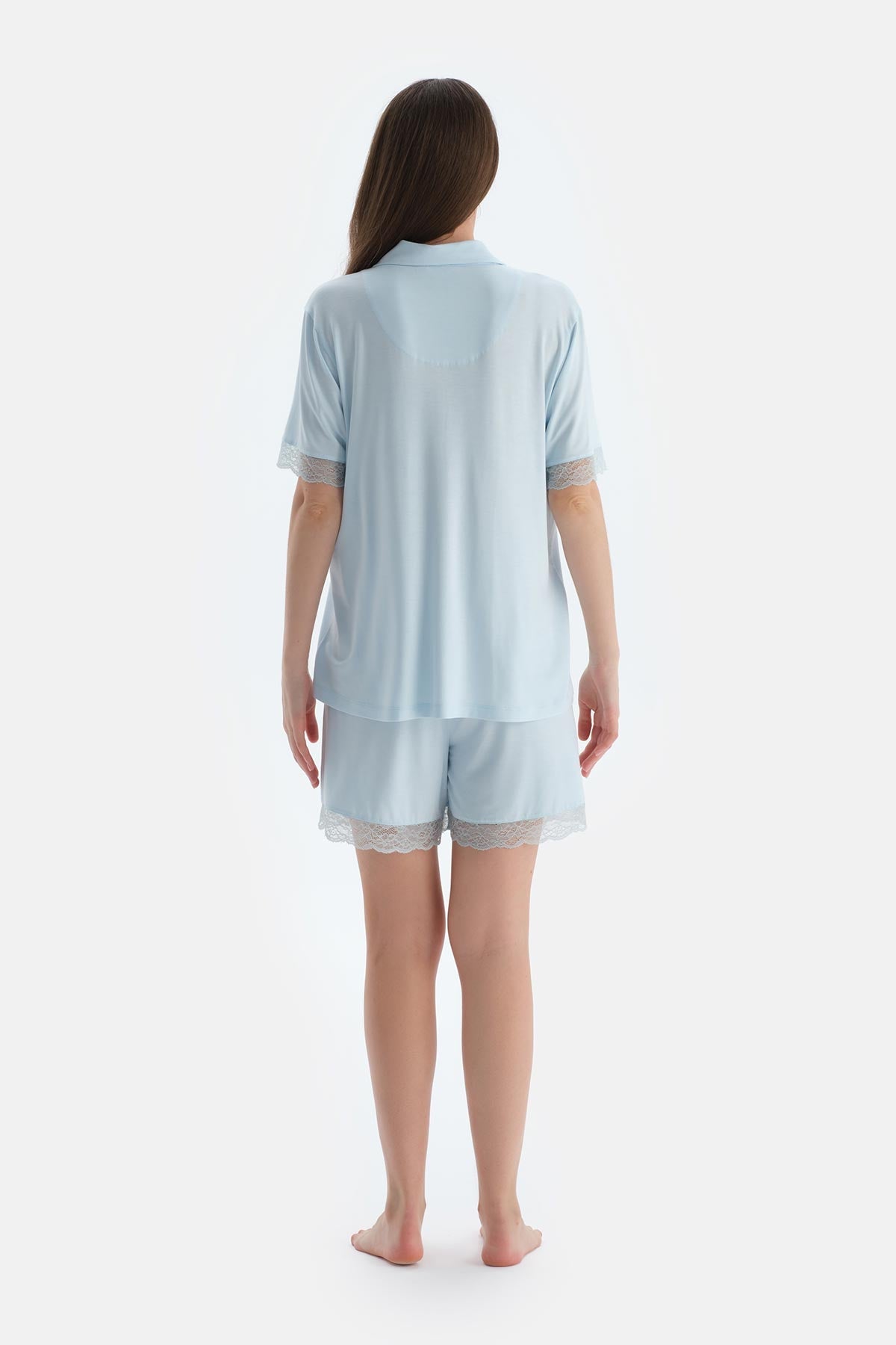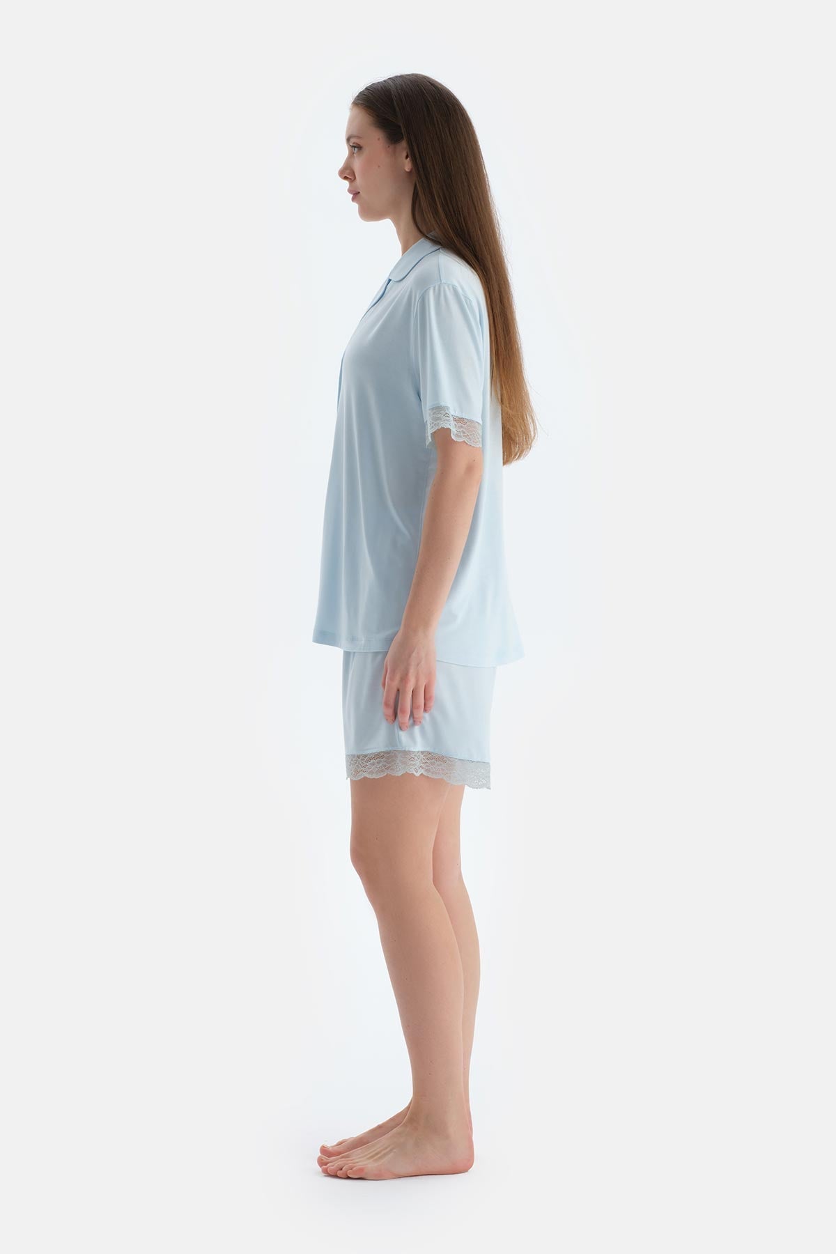 Açık Mavi Dantel Detaylı Kısa Kollu Gömlek Şort Pijama Takımı