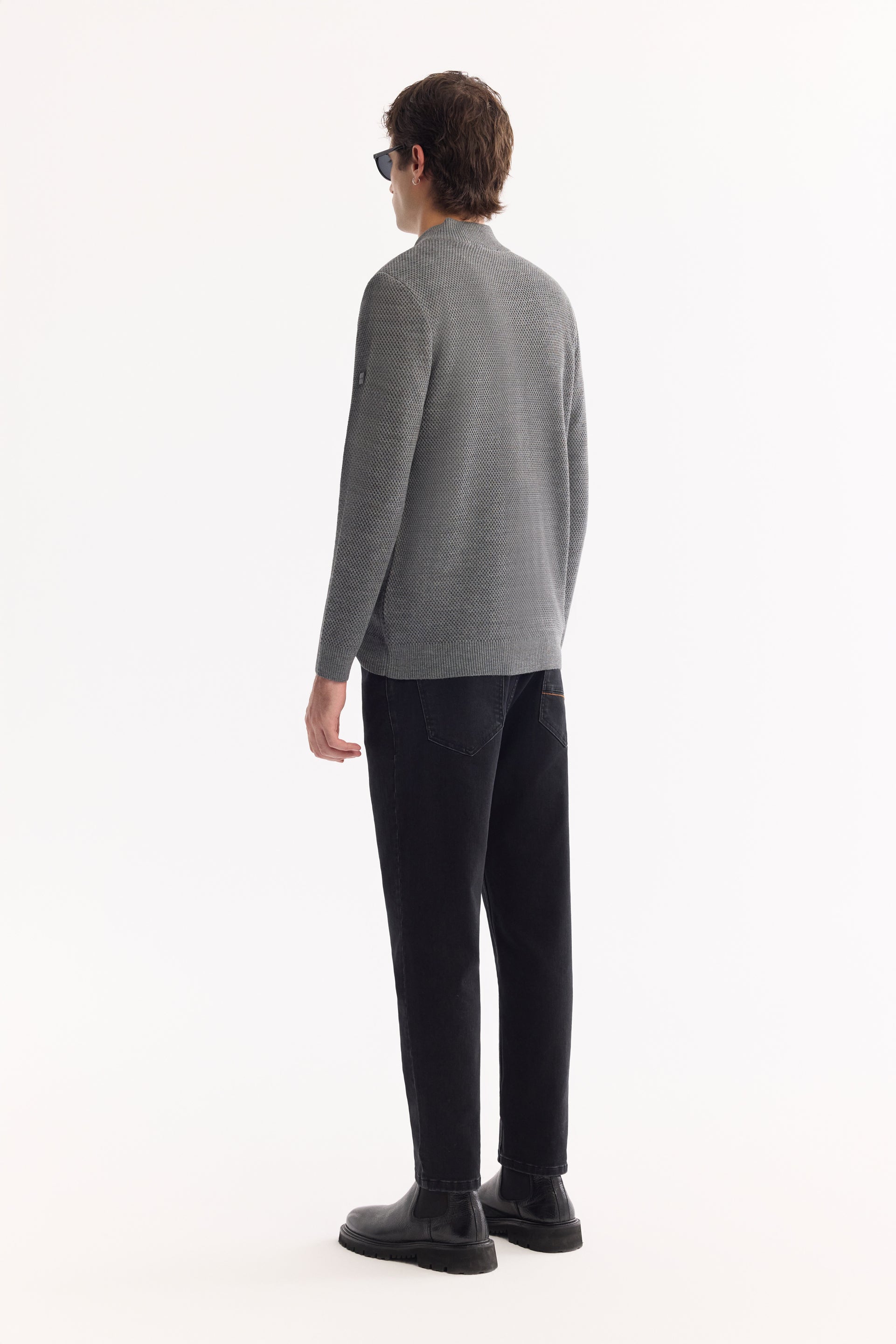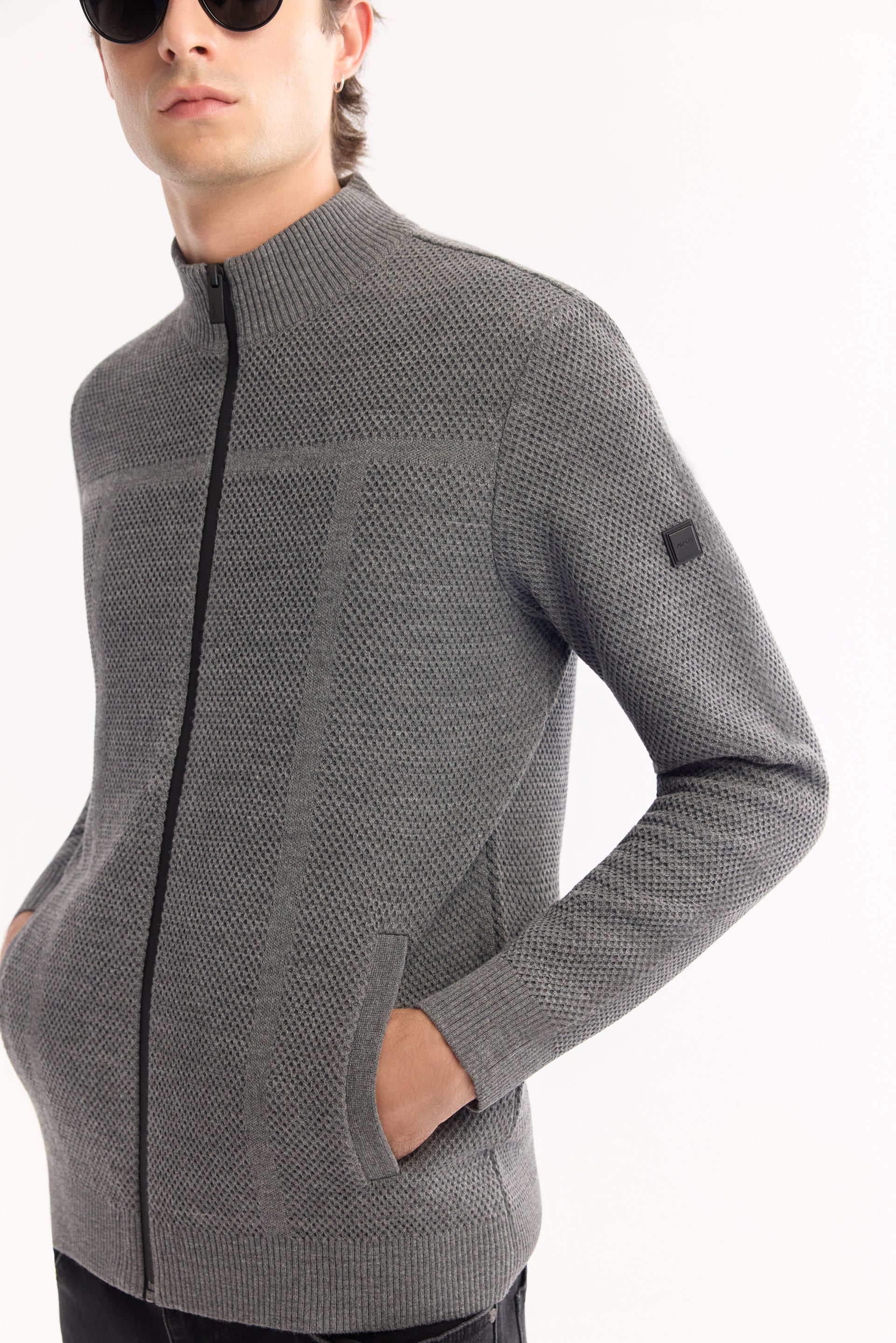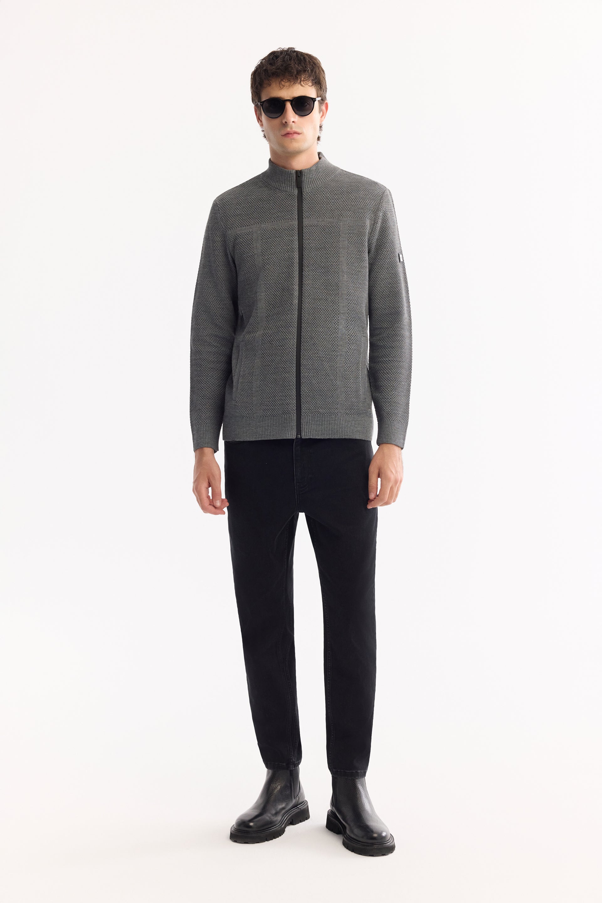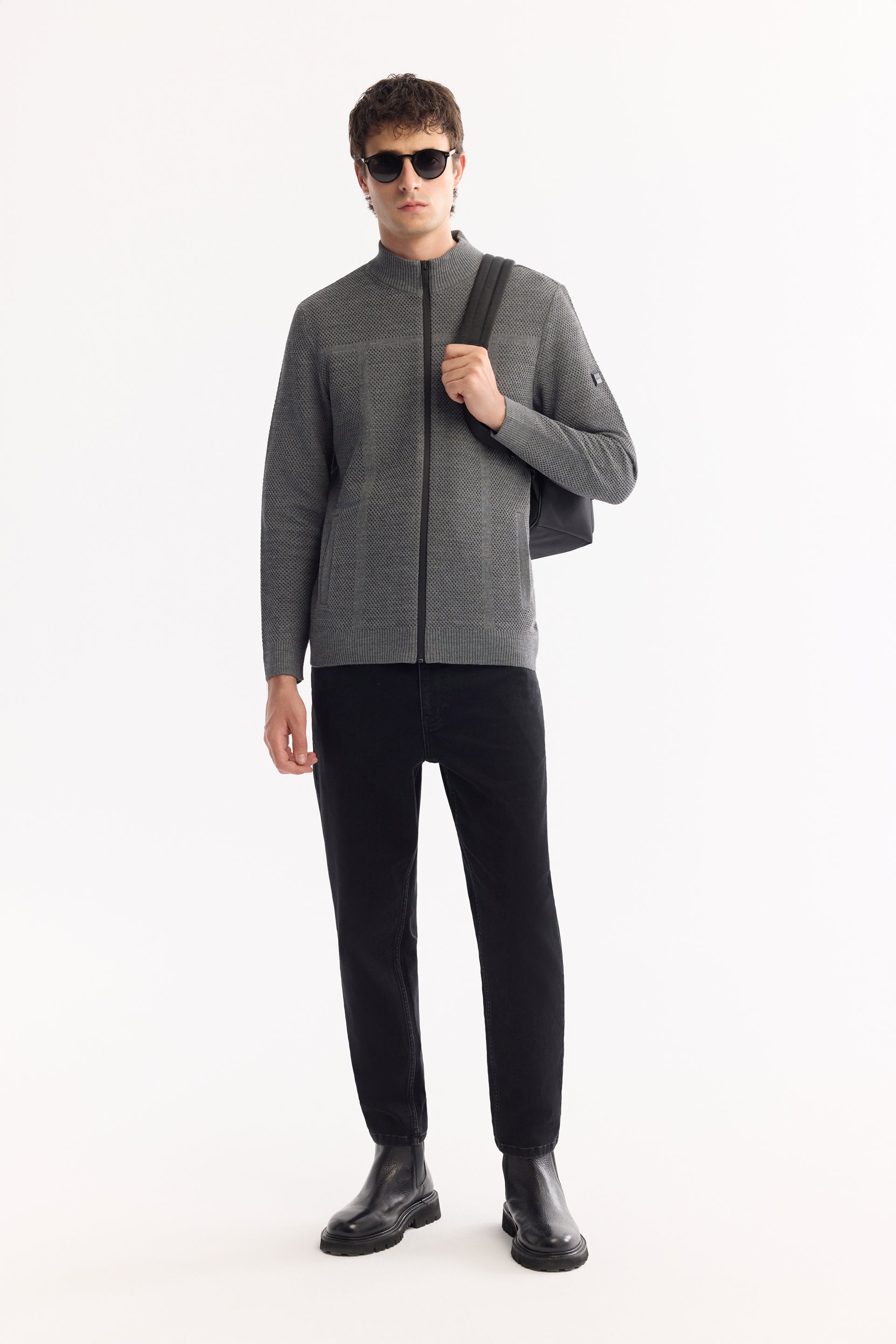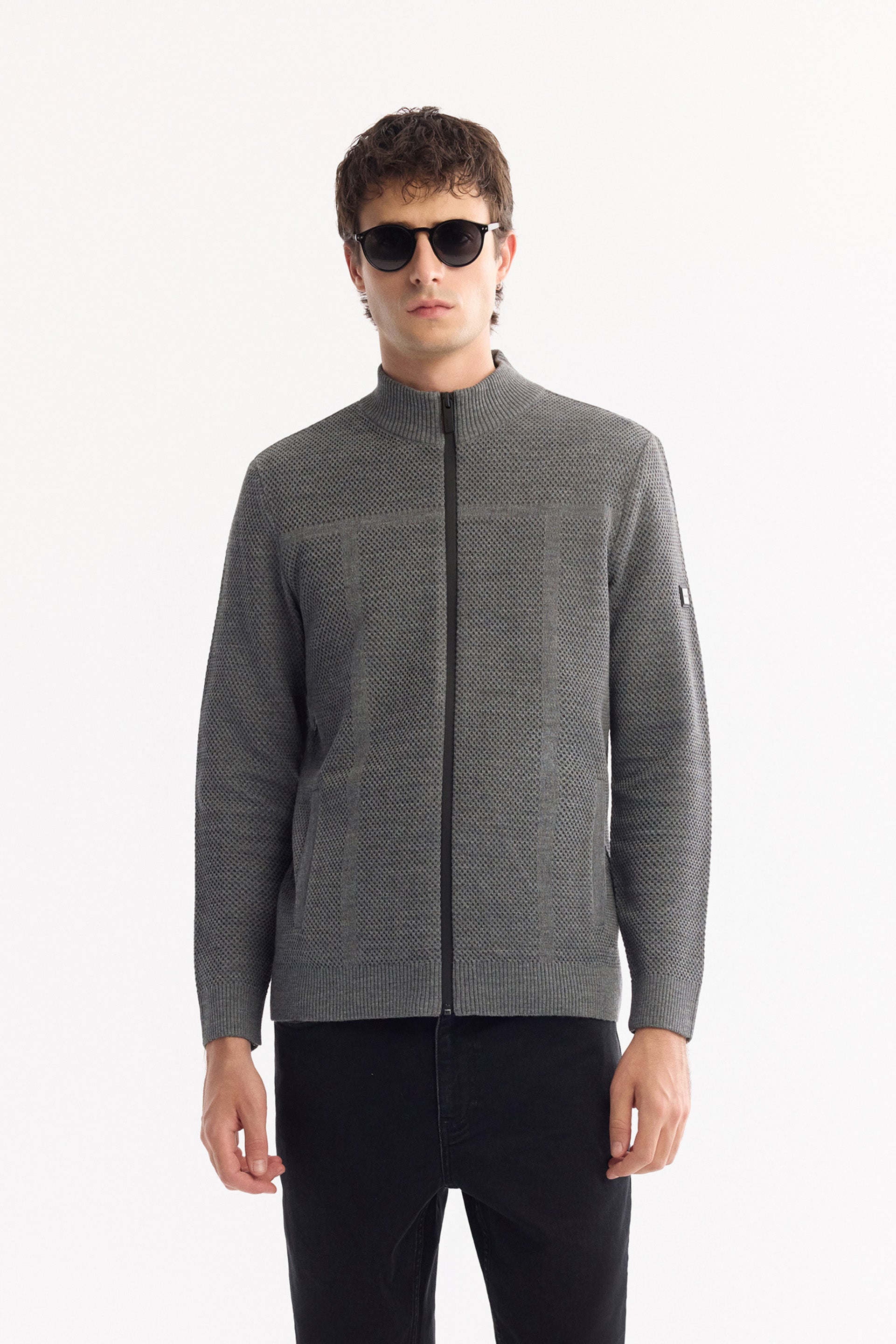 Antrasit Tam Fermuarlı Dik Yaka Petek Dokulu Yün/akrilik Iplik Hırka