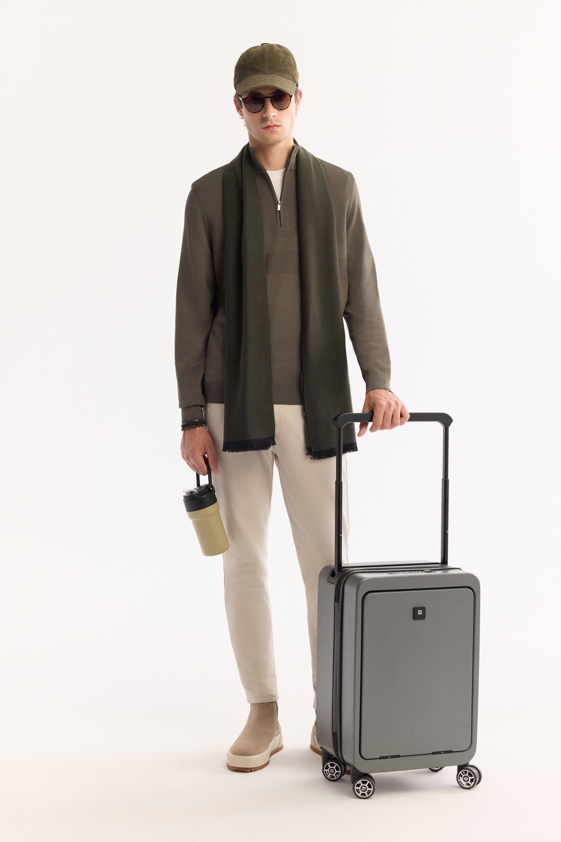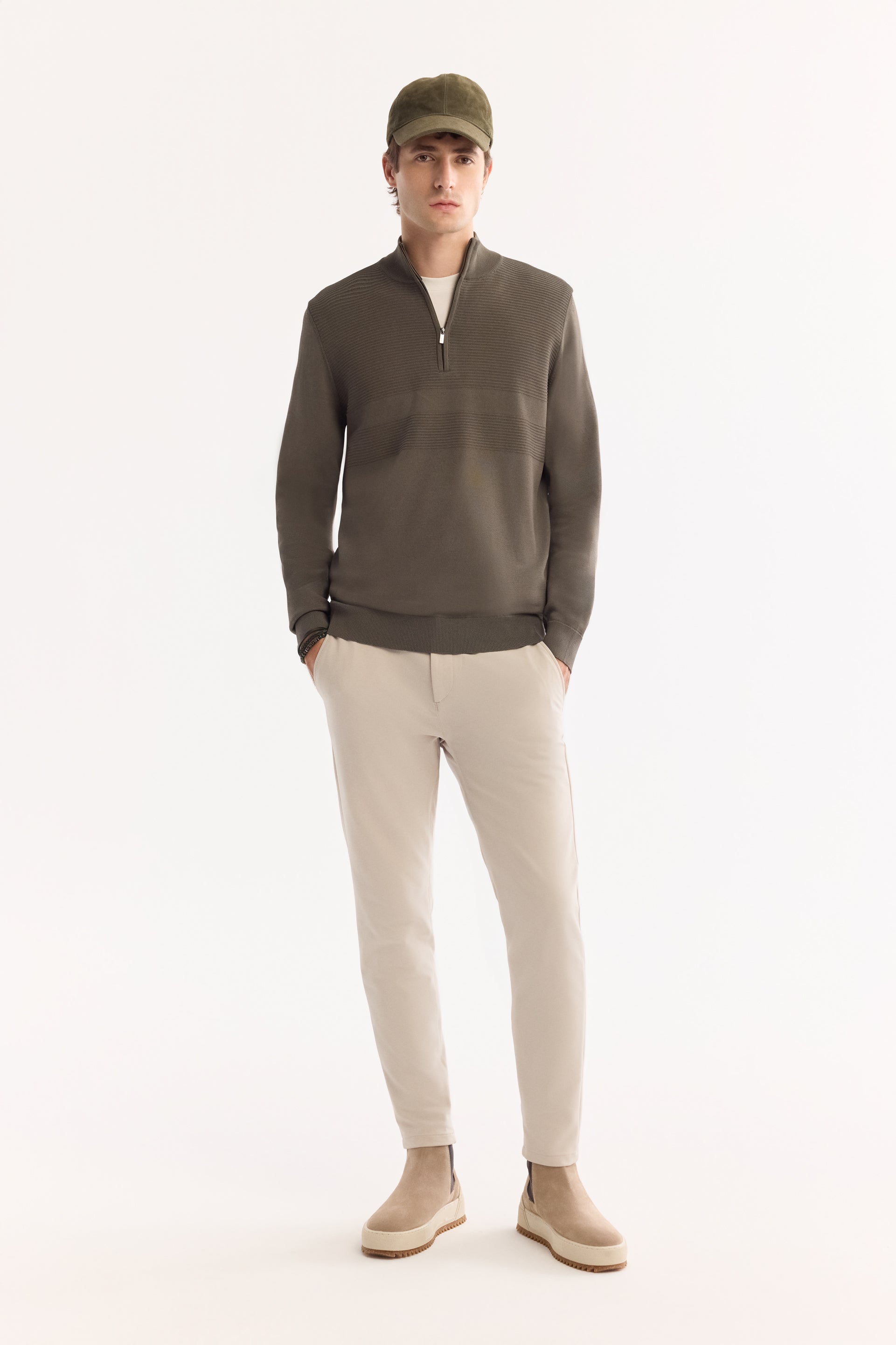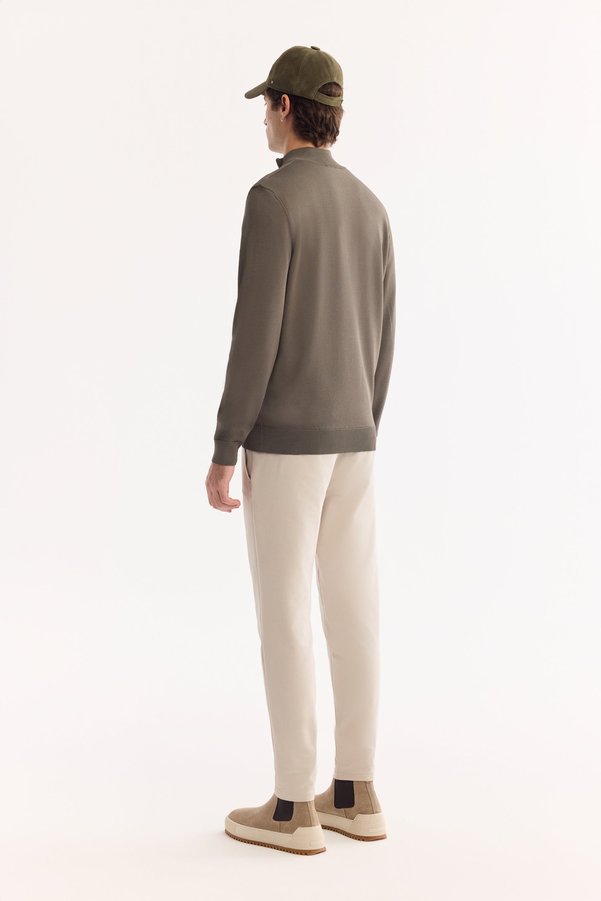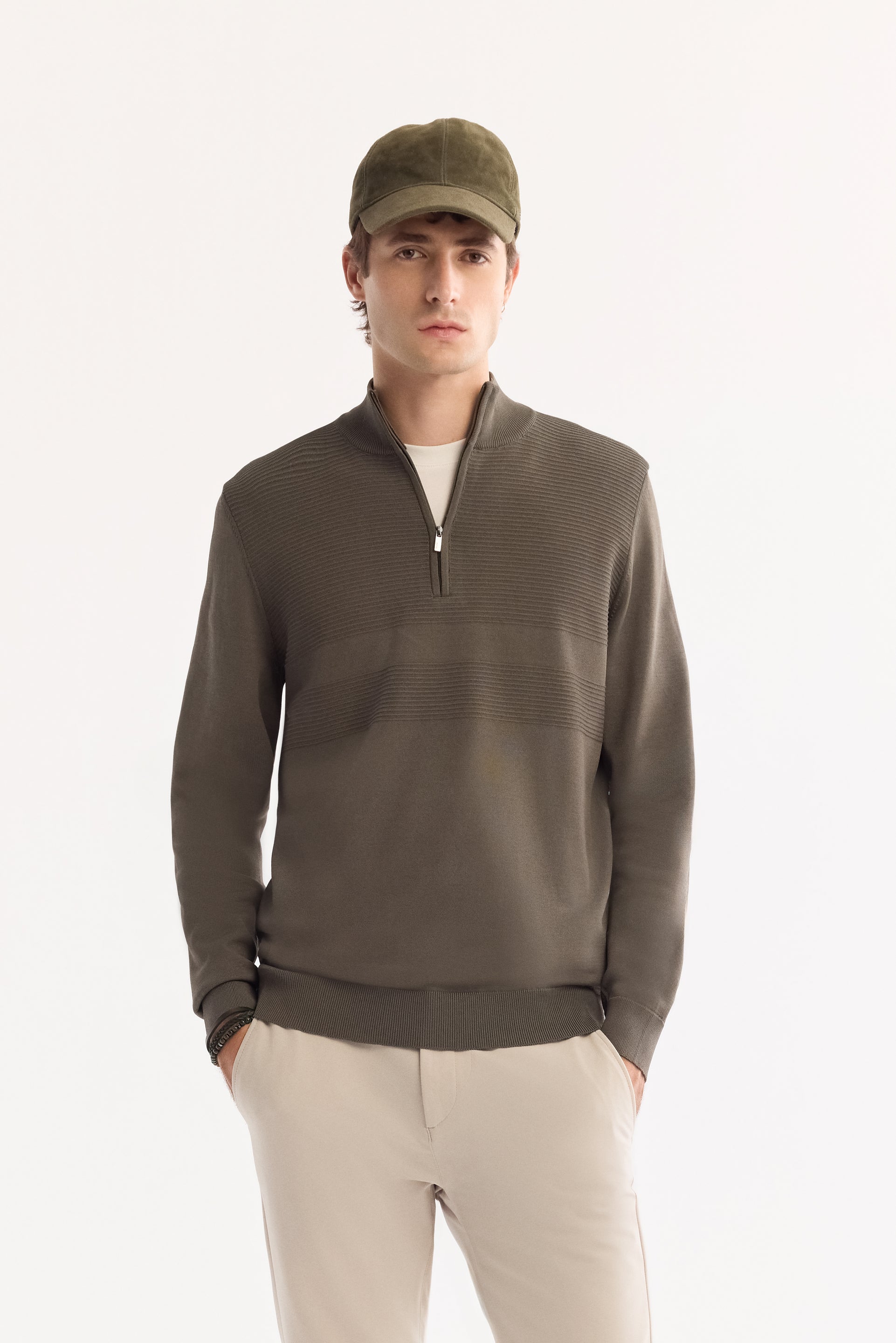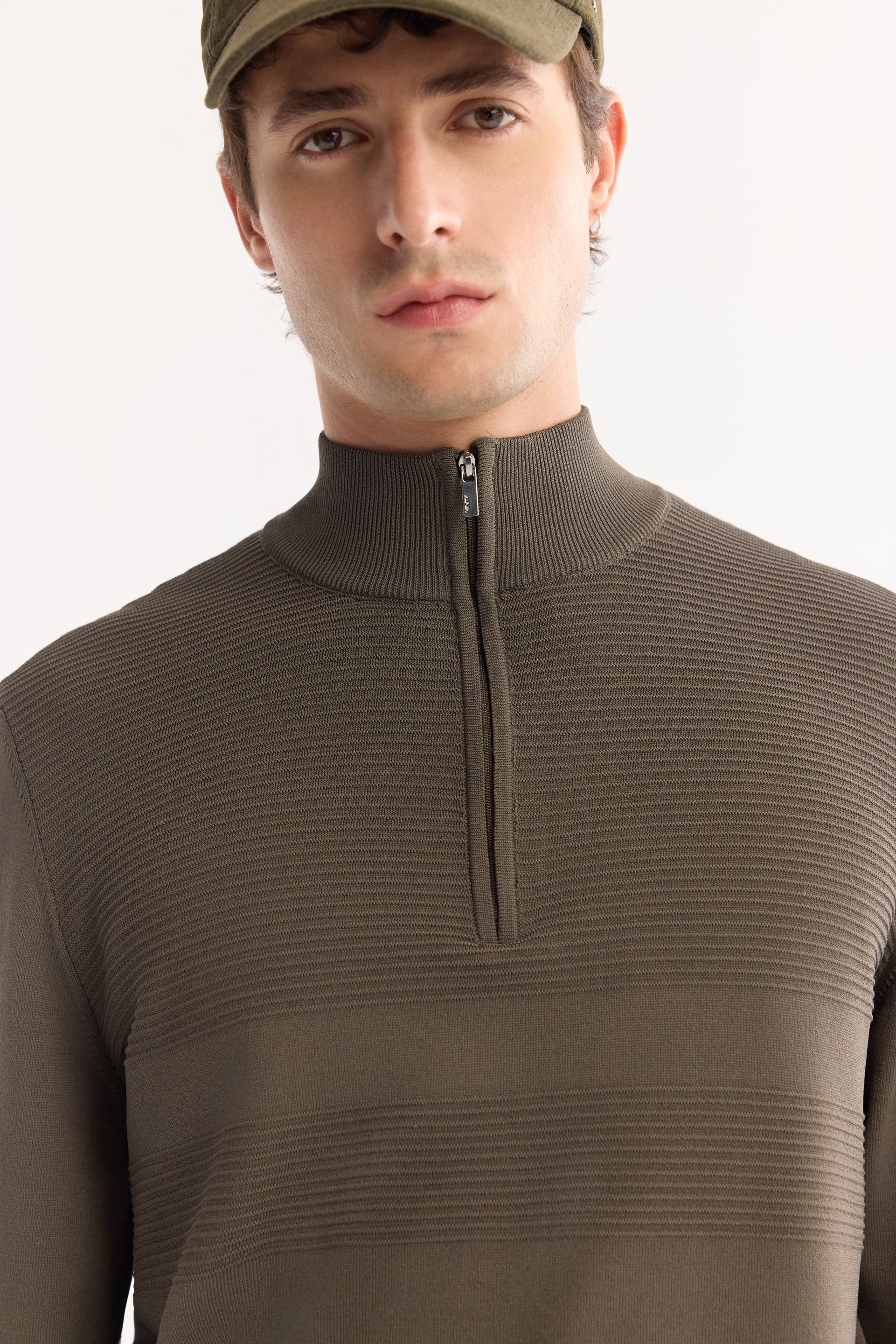Haki Dik Yaka Fermuarlı Desenli Rayon Iplik Kazak
