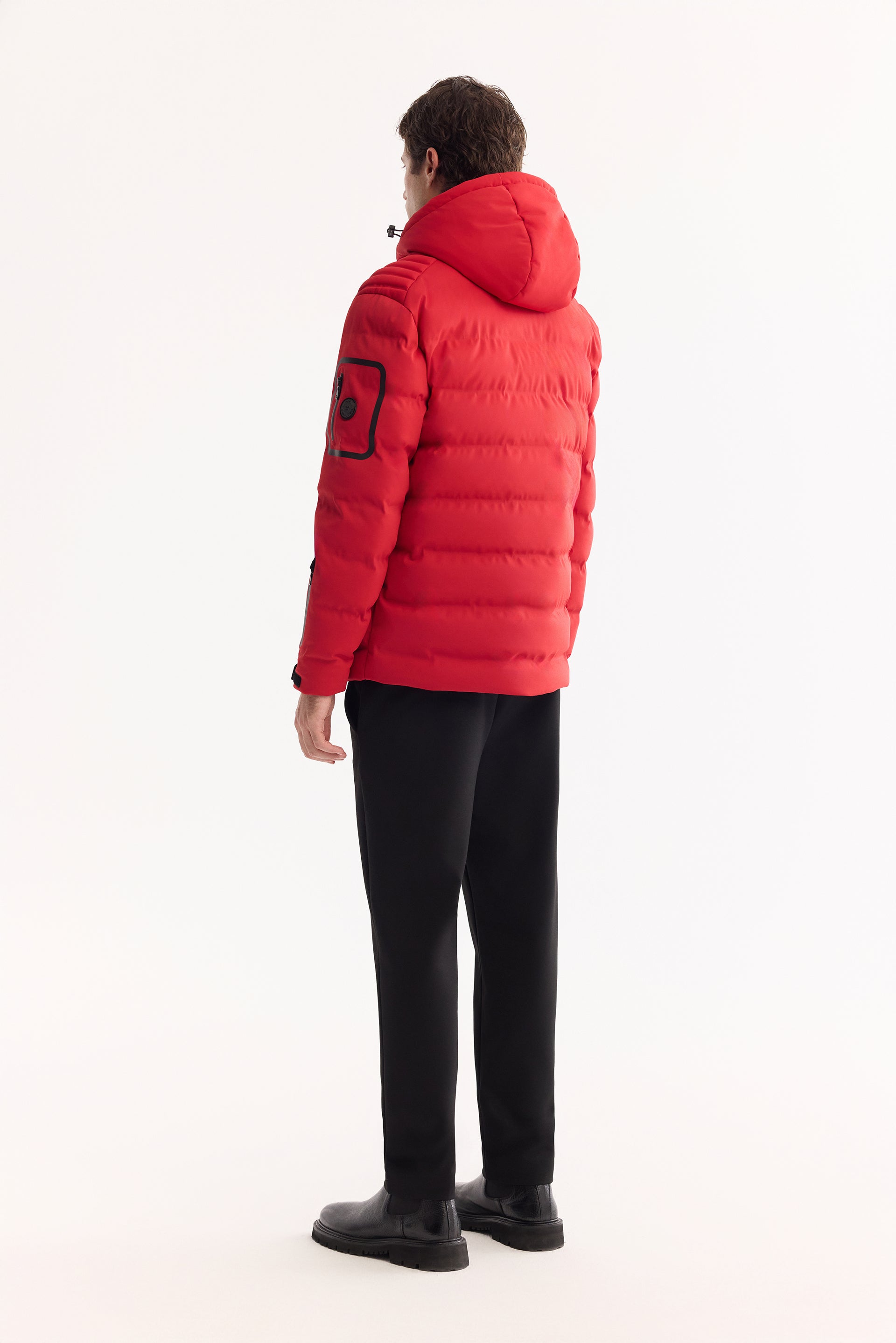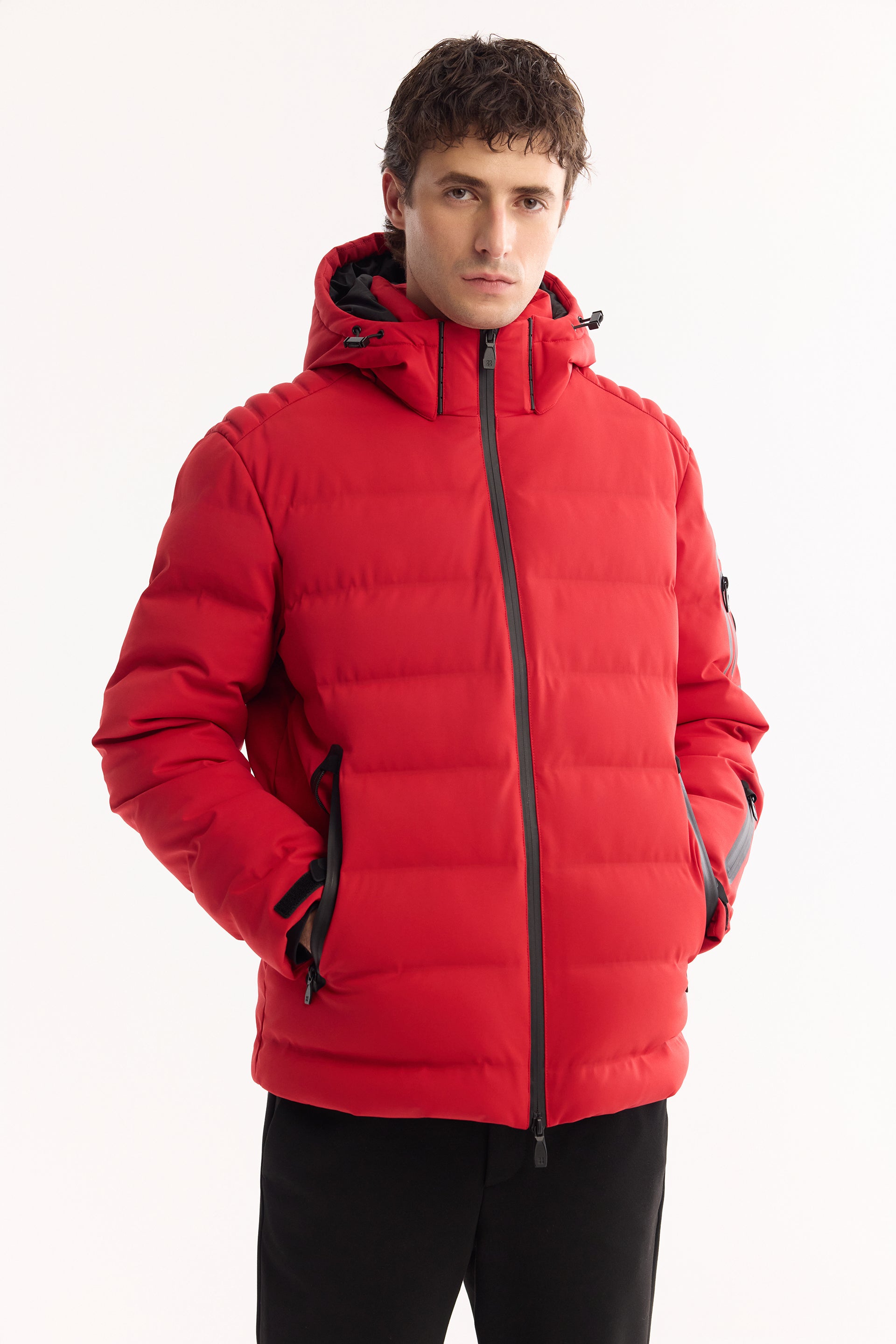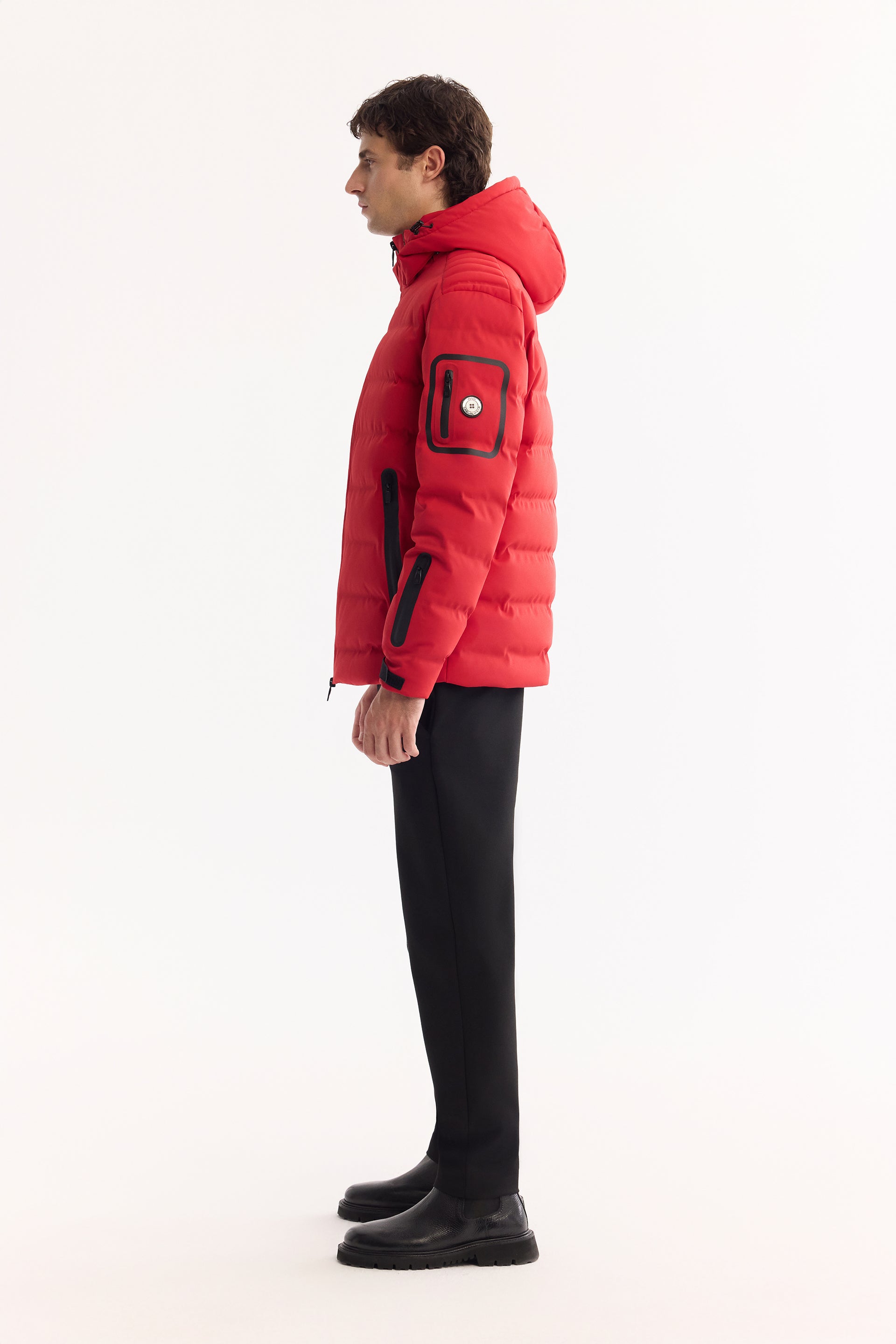 Kırmızı Takma Çıkma Kapüşonlu Düz Poliamid-elastan Kumaş Mont