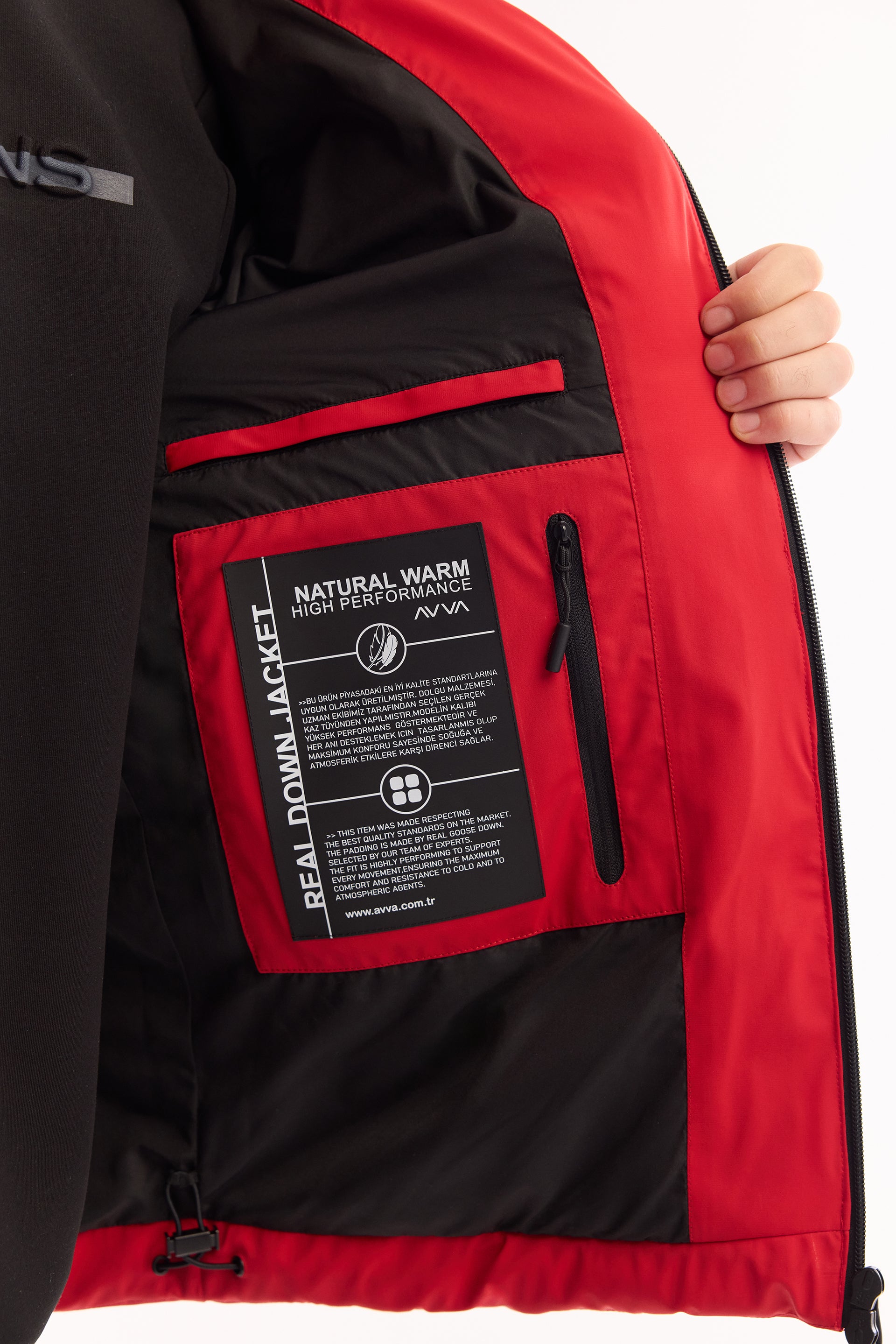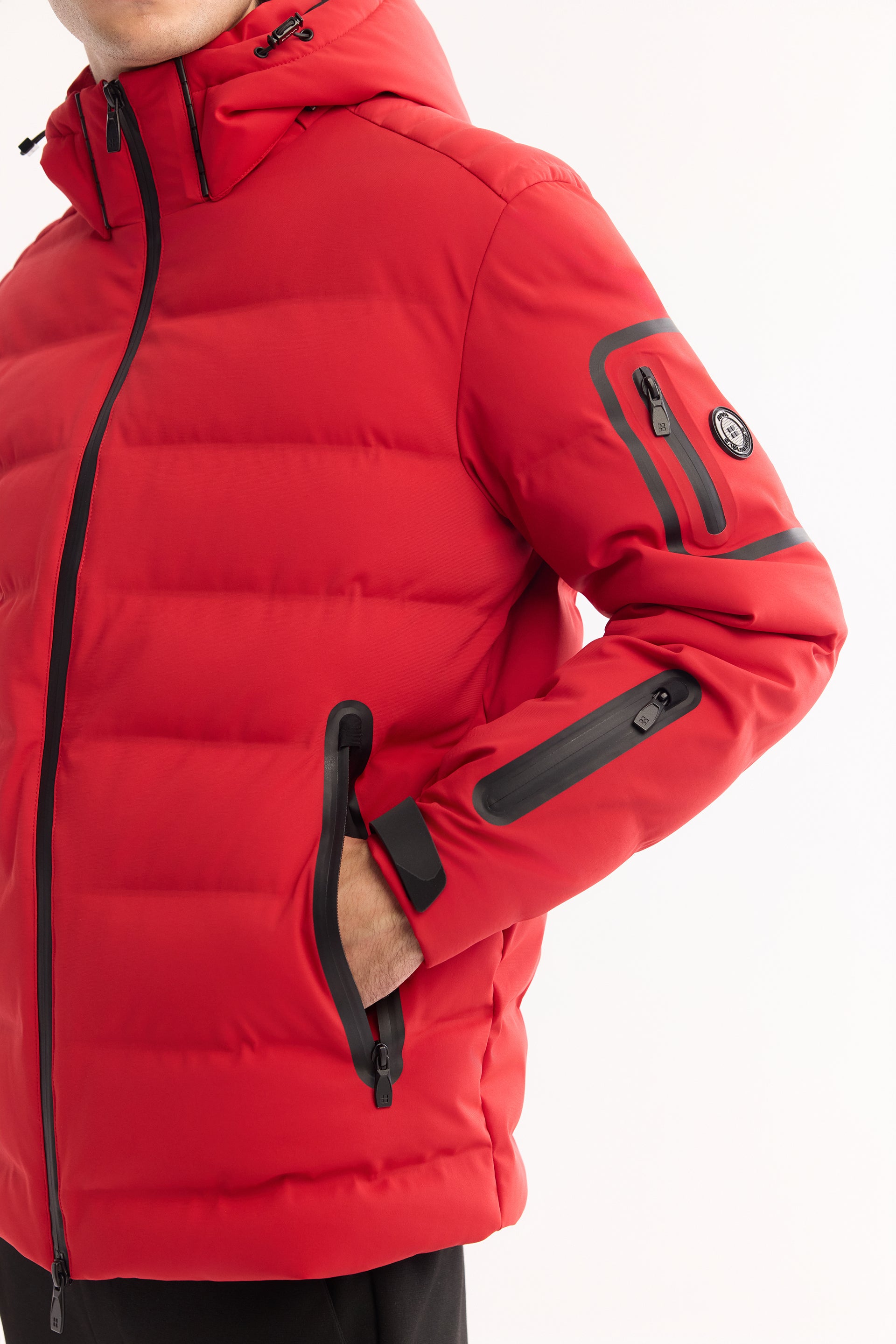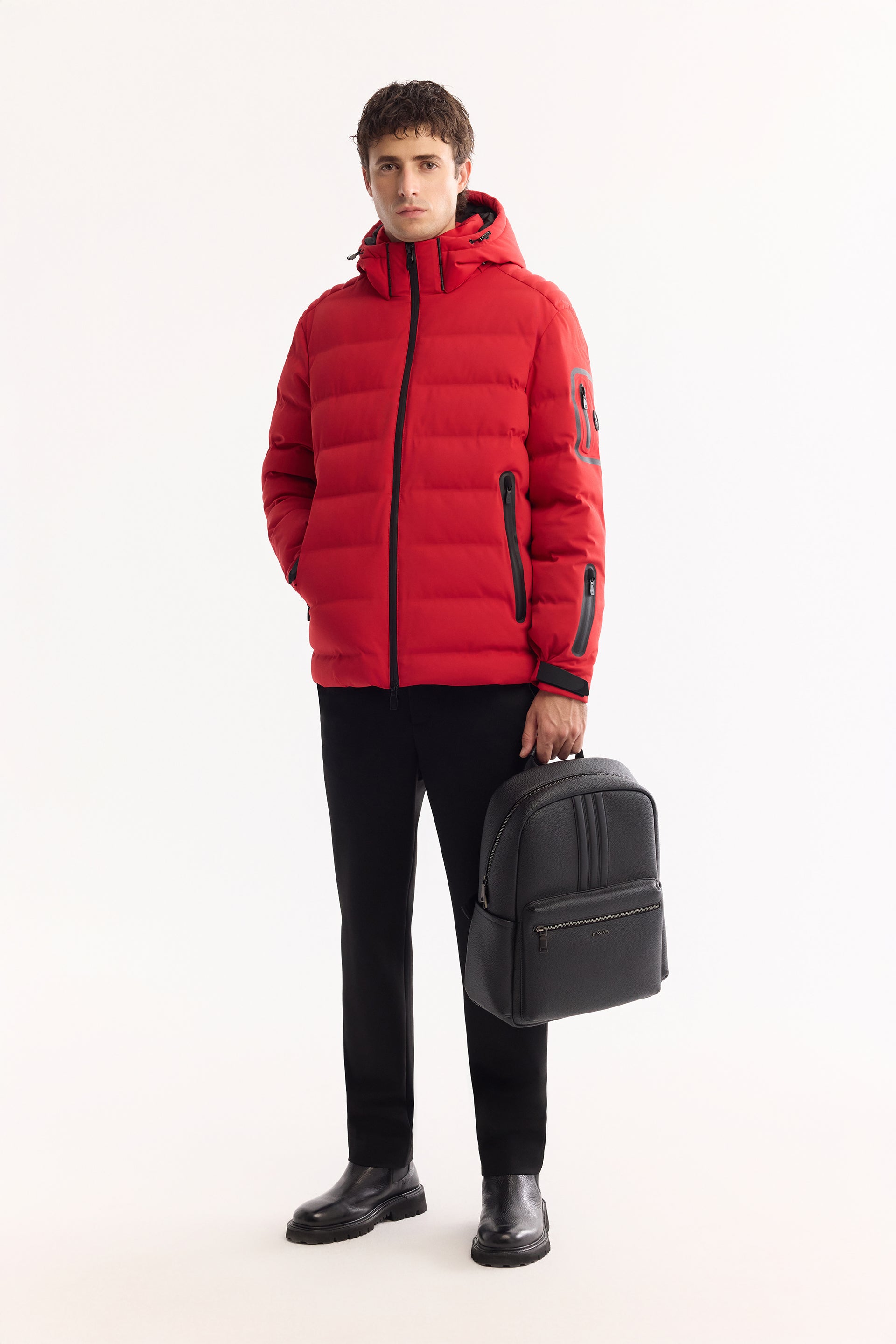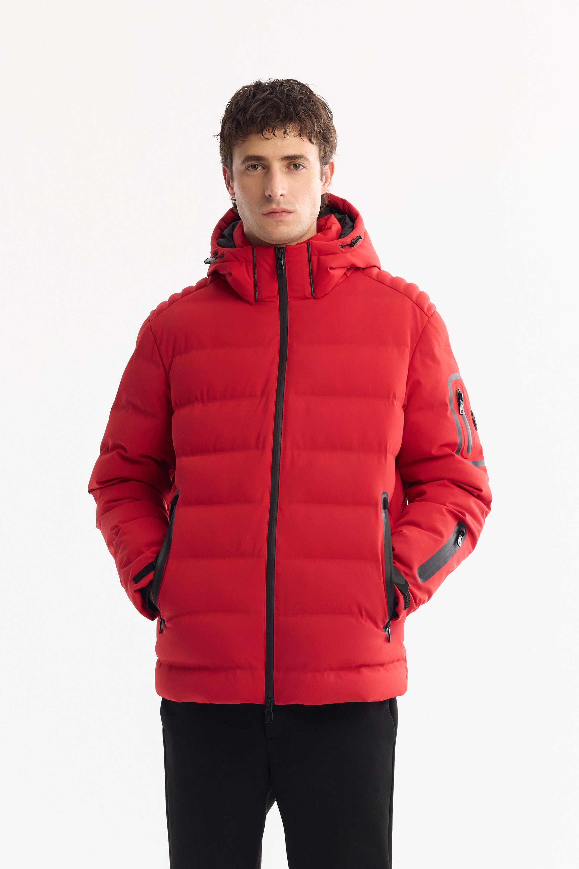 Kırmızı Takma Çıkma Kapüşonlu Düz Poliamid-elastan Kumaş Mont