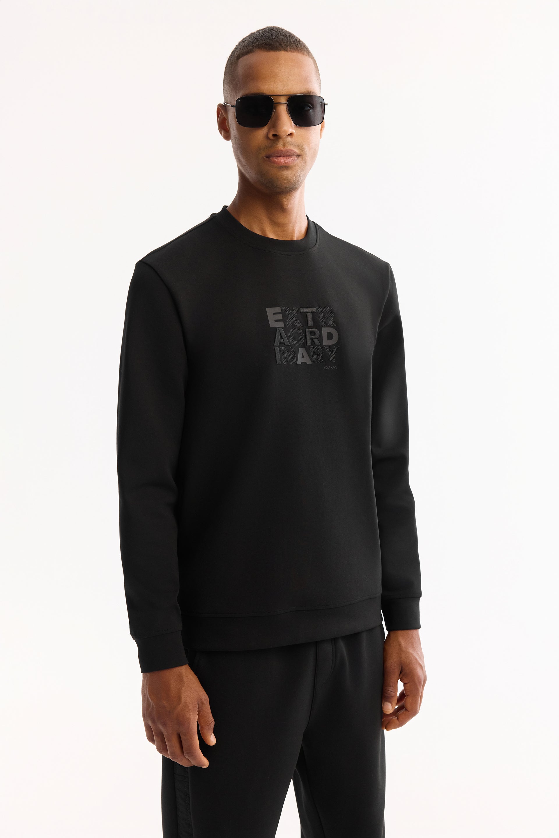 Siyah Bisiklet Yaka Nakışlı Interlok Kumaş Sweatshirt