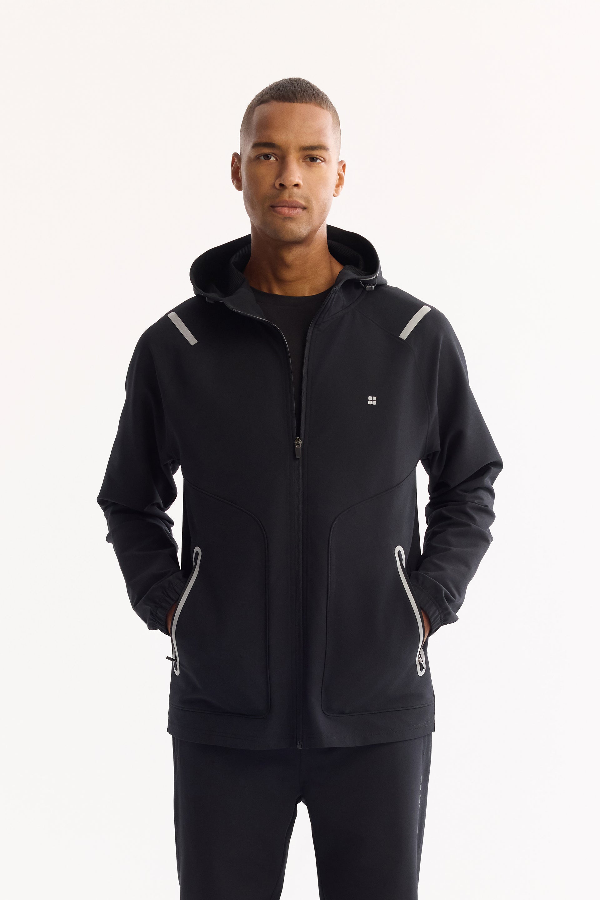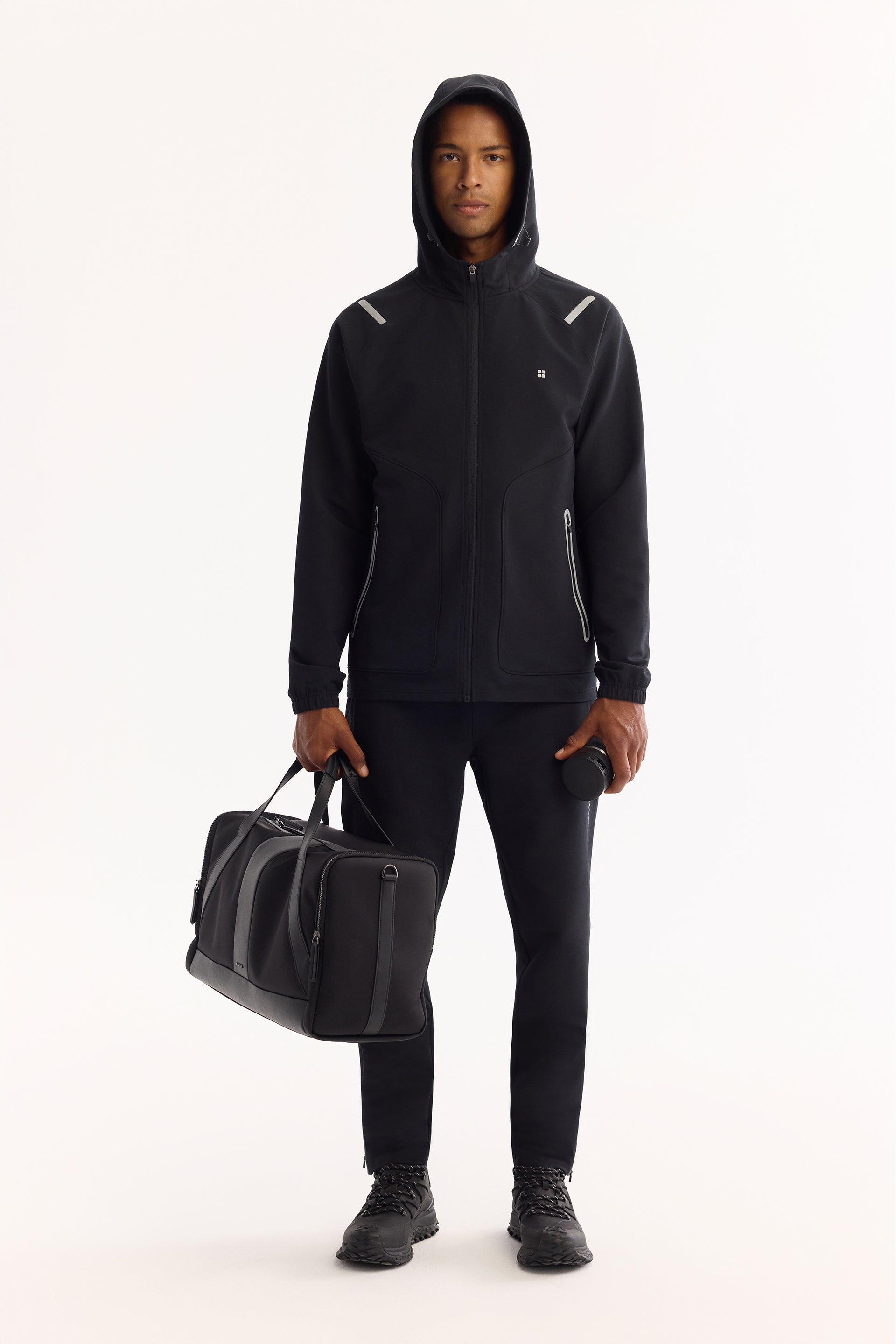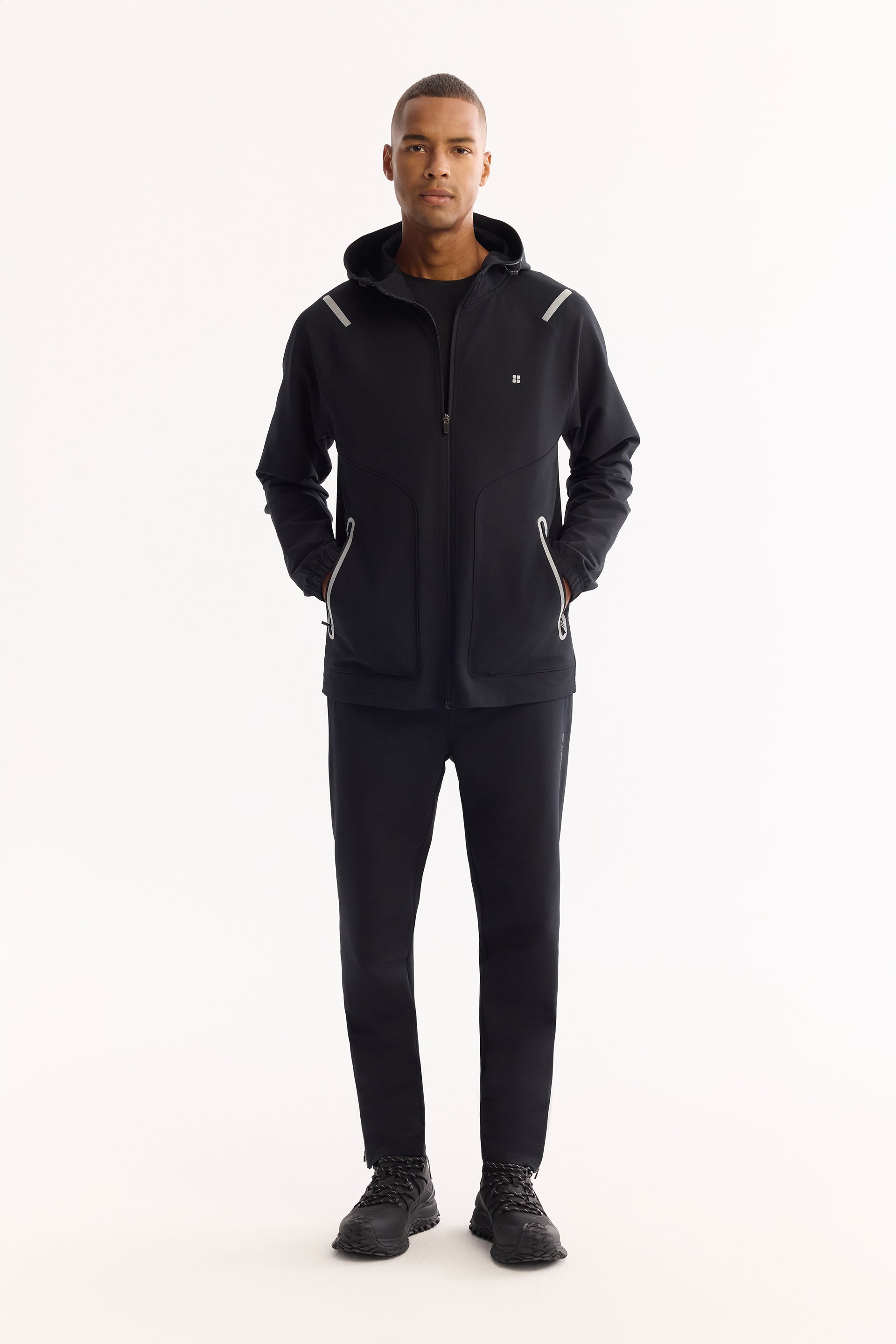 Siyah Kapüşonlu Yaka Reflektör Baskılı Teknik Kumaş Hırka