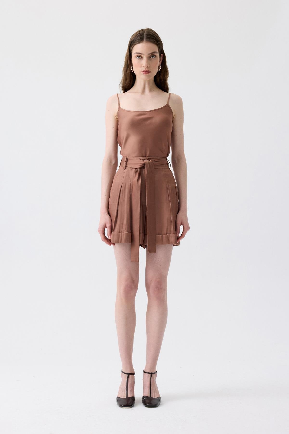 Bağlama Kemerli Rahat Form Mini Kahverengi Şort