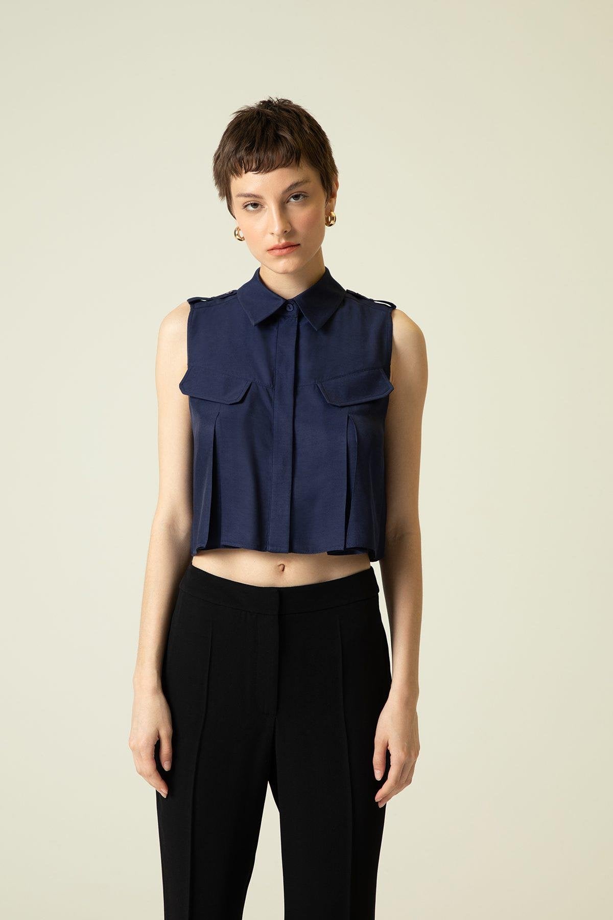 Cep Kapağı Detaylı Lacivert Crop Gömlek
