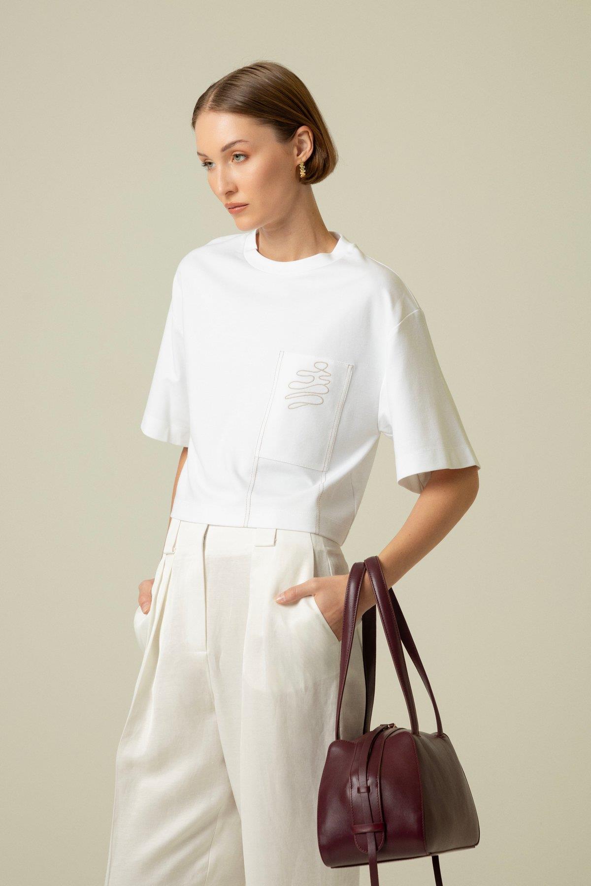 Cep Nakış Detaylı Beyaz T-Shirt